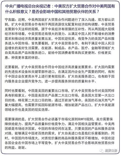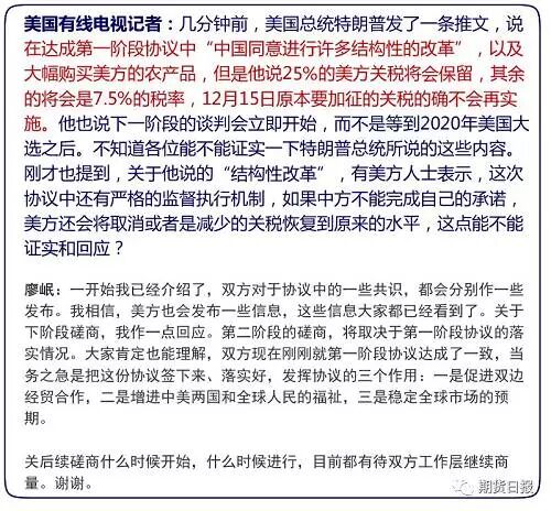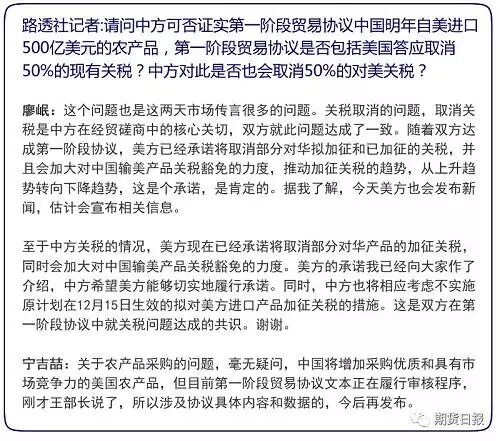 据人民日报,宁吉喆表示,毫无疑问,中国将增加采购优质和具有市场竞争力的美国农产品,但目前第一阶段贸易协议文本正在履行审核程序,刚才王部长说了,所以涉及协议具体内容和数据的,今后再发布。