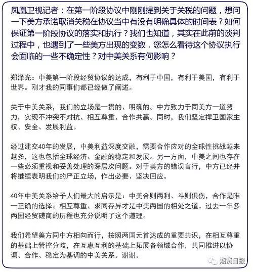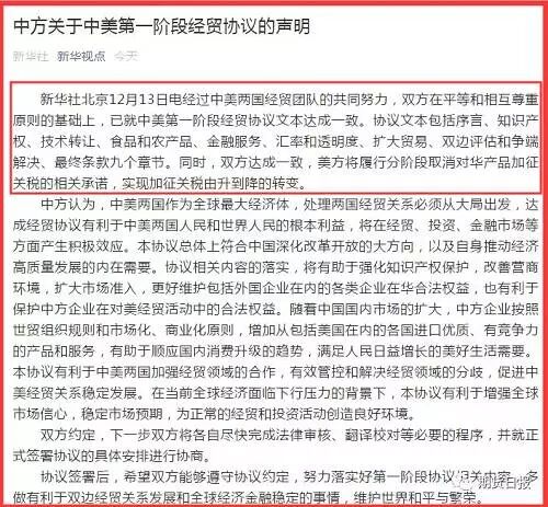 小编按:中美就第一阶段贸易协议文本达成一致,13日白天已经在传,而股市也春江水暖股先知,以大涨来回应。晚间突然传来消息,说晚上十点半将举行国务院新闻发布,介绍有关情况。结果延期到了十一点开始(大家猜为什么会是晚上?因为是中美同时举行发布会),六部委代表齐上阵,都是参与贸易谈判的代表团成员,亲自面对媒体解读第一阶段贸易协议的相关问题。