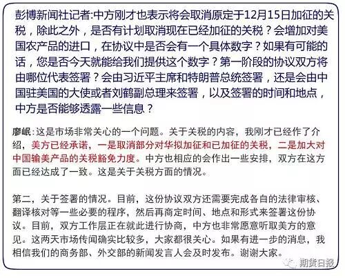 财政部副部长廖岷:中方也将相应考虑不实施原计划在12月15日生效的拟对美方进口产品加征关税的措施
