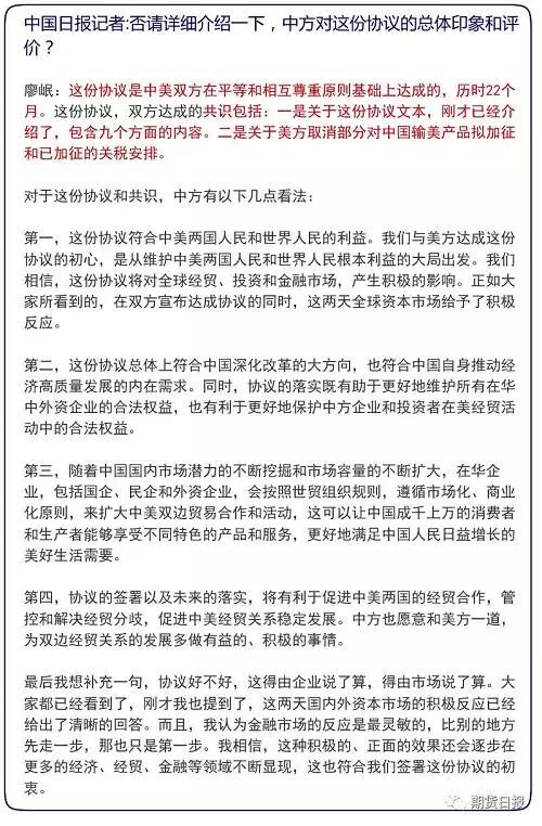 据人民日报,财政部副部长廖岷表示,关于下阶段磋商,我作一点回应。第二阶段的磋商,将取决于第一阶段协议的落实情况。大家肯定也能理解,双方现在刚刚就第一阶段协议达成了一致,当务之急是把这份协议签下来、落实好,发挥协议的三个作用:一是促进双边经贸合作,二是增进中美两国和全球人民的福祉,三是稳定全球市场的预期。有关后续磋商什么时候开始,什么时候进行,目前都有待双方工作层继续商量。