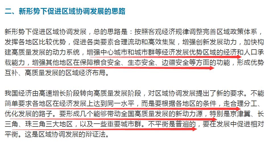以上两段截屏中的文字,第一段曾出现在今年8月26日“中央财经委第五次会议”的通稿里(求是杂志刊登的这文章,就是当时他在“中央财经委第五次会议”上讲话的一部分)。当时我曾做过分析,这段话的意思很明白:能做大做强的中心城市、城市群要尽量做大;至于普通的中小城市,主要去“保障粮食安全、生态安全、边疆安全”了,没有必要继续扩张规模、强行上一些新项目了。截屏里的第二段文字,则是要求尊重规律,承认“大中小城市均衡发展”是不可能实现的,城镇化的规律就是“强者恒强”。所以说,“不平衡是普遍的,要在发展中促进相对平衡。这是区域协调发展的辩证法。”2、三大城市群被赋予重要使命,其中长三角、珠三角被认为走在前面。文章要求:“要形成几个能够带动全国高质量发展的新动力源,特别是京津冀、长三角、珠三角三大地区,以及一些重要城市群。”由此可见,京津冀、长三角、珠三角三大城市群被寄予厚望。至于文章提到的“一些重要城市群”,虽然没有一一点名,但毫无疑问包括成渝城市群、长江中游城市群、中原城市群、山东半岛城市群、海峡西岸城市群等。文章还说:“区域经济发展分化态势明显。长三角、珠三角等地区已初步走上高质量发展轨道。”从这段表述看,领导对长三角、珠三角的经济转型评价比较高,认为“初步走上高质量发展轨道”。至于京津冀、成渝等城市群没有包含其中,显然需要继续努力。在表扬了长三角、珠三角的同时,文章还以赞赏的口吻提及了10大城市。下面是相关内容的截屏: