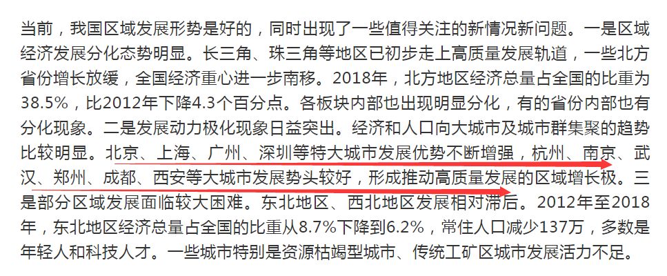 可以看出,领导用两句话、分两个层次,分别表扬了10个城市,它们是北京、上海、广州、深圳,以及杭州、南京、武汉、郑州、成都、西安。这些城市都被认为是“优势不断增强”、“发展势头较好”、“形成了推动高质量发展的区域增长极”。这个评价对于10大城市来说,都是喜讯。仔细研究这10个城市,我们会发现:除了深圳、杭州、南京之外,其他7个都是“国家中心城市”。目前中国有9个“国家中心城市”,这里提及了7个。哪两个没有明确提及?是天津和重庆,他们都是直辖市,级别很高。但众所周知,天津经济处于深度调整之中,而重庆仍然是需要中央财政巨额“转移支付”的城市,尚未“形成推动高质量发展的区域增长极”。这个名单对杭州和南京来说,是特大喜讯。因为这意味着在最高层心目中,杭州、南京位次仅次于北上广深,完全可以跟“国家中心城市”平起平坐。所以,虽然在长三角一体化的最新规划里,杭州、南京仍然定位不算高,但两个城市取得的成就是被认可的!对于广州来说,这也是重要利好。至少说明,北上广深的次序目前尚未被官方表述改变。至于对郑州、西安这两个略偏弱的“强二线城市”来说,也是大喜讯,说明成绩被认可。郑州甚至排在了成都的前面。文章提及了6条促进区域经济发展的举措,其中包括“全面放宽城市落户条件,完善配套政策,打破阻碍劳动力流动的不合理壁垒,促进人力资源优化配置”。但北京和上海仍然是最特殊的两个城市,文章重申“北京、上海等特大城市要根据资源条件和功能定位合理管控人口规模”。既然国家承认“区域经济发展分化态势明显,经济重心进一步南移”,要求尊重规律,顺势而为,那么是不是东北就不用振兴了?当然不是!文章用专门一节,讨论了“推动东北全方位振兴”的问题。文章说: