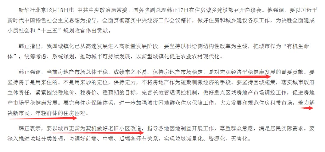 对于当前楼市,高层真实的看法什么?是乐观还是悲观,是满意还是不满意?在今天傍晚6点之前,大家只能猜测,而没有100%的把握。比如12月6日召开的“定调2020年经济发展”的政治局会议,没有提到房地产。坊间主流的猜测是:没有“消息”就是最好的“消息”,这传递了暖意。12月12日结束的2019年中央经济工作会议,则重申了“房住不炒”。其具体表述为:要加大城市困难群众住房保障工作,加强城市更新和存量住房改造提升,做好城镇老旧小区改造,大力发展租赁住房。