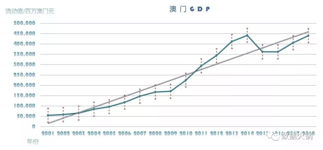 从澳门历年经济规模可以看到,在2013-2015年,曾出现明显的下滑,危机浮现。