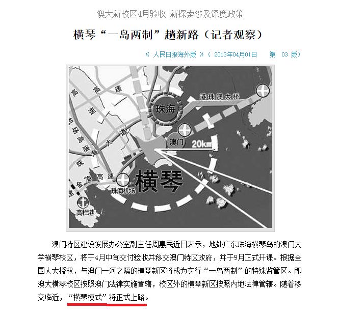 早在2013年,人民日报就曾报道,横琴“一岛两制”趟新路——根据全国人大授权,澳大横琴校区按照澳门法律实施管辖,校区外的横琴新区按照内地法律管辖。