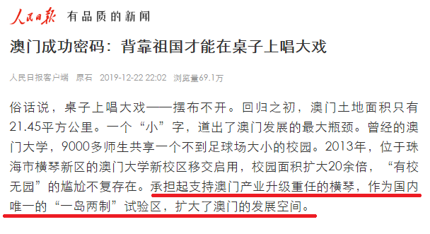 人民日报昨日发文点评澳门成功密码。全国唯一的“一岛两制”试验区,承载着澳门产业升级的希望。