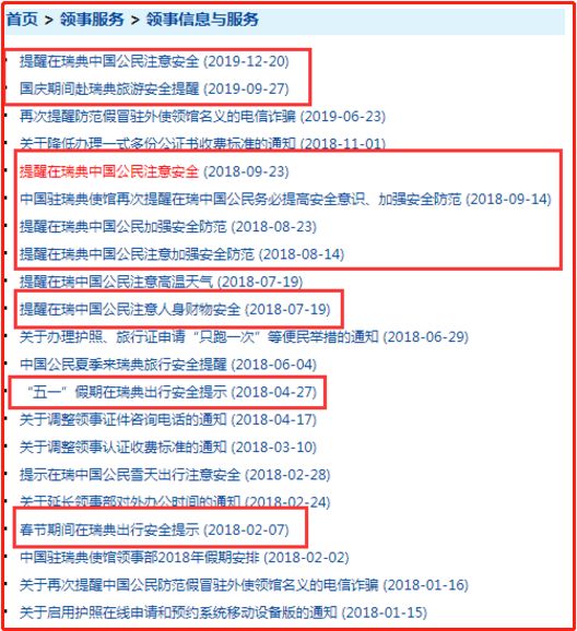 自2018年以来,中国驻瑞典大使馆已发布多起公告,提醒在瑞典中国公民注意安全。