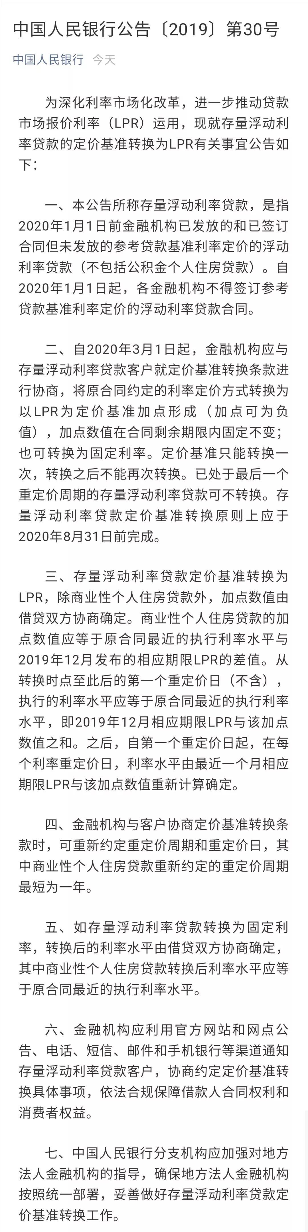 这段话有两个含义。第一,“商业性个人住房贷款”之外的,可以浮动利率的贷款,其“加点”双方协商。所谓“加点”,就是在LPR利率上“上浮”的点数。这类房贷,客户有谈判权。第二,“商业性个人住房贷款”因为涉及楼市调控政策,而且客户量巨大,所以央行“一刀切”了。加点数,就是你之前享受的利率和2019年12月20日公布的5年期LPR利率的差值。说白了,就是2020年的“商业性个人住房存量贷款”保持利率不变!你2019年是什么利率,2020年还是这样!“之后,自第一个重定价日起,在每个利率重定价日,利率水平由最近一个月相应期限LPR与该加点数值重新计算确定。”这句话的意思是说,从2021年开始,你的房贷利率就可能出现变化了,变化时候参照“利率重定价日”最近的一次LPR和“加点”之和。也就是说,2020年的这次利率重新定价,你的实际贷款利率不变。但银行会告诉一个“加点”数,替代之前的上浮比例。到了2021年,如果LPR降息了,那么你的房贷利率也会降息,因为“加点”的数值被固定了!至于10月8日后签署的,已经按照LPR定价的房贷,你的问题在合同里早就明确了,可以不用关心今天的事情。商业房贷为什么要给出“重新定价”的选项?因为贷款期太长了,而国家也要通过降息、加息来影响存量房贷,以实现宏观调控。以前的玩法是:每年的1月1日,根据前一年最后一次利率变动结果,来重新确定未来一年的房贷利率。现在未必是1月1日了,看各个银行和你贷款时间,会有差异。央行还明确——“金融机构与客户协商定价基准转换条款时,可重新约定重定价周期和重定价日,其中商业性个人住房贷款重新约定的重定价周期最短为一年”。也就是说,房贷利率只能1年1变,不能半年或者每月变化。央行今天的公告说——“如存量浮动利率贷款转换为固定利率,转换后的利率水平由借贷双方协商确定,其中商业性个人住房贷款转换后利率水平应等于原合同最近的执行利率水平。”也就是说,央行给了一个新选择:你可以选择保持房贷利率不变,维持30年!要不要这样选?傻子才这样选,因为长期利率走低是世界性趋势,前几天周小川还说,中国有能力延缓进入负利率时代。也就是说,周小川认为未来负利率是必然的,只是中国有能力延缓而已。想想看,日本、欧盟都是负利率了,国际之间货币存在竞争关系,除非出现黑天鹅,否则中国利率长期是走低的,所以最好选择1年重新定价一次。自2020年3月1日起,金融机构应与存量浮动利率贷款客户就定价基准转换条款进行协商,将原合同约定的利率定价方式转换为以LPR为定价基准加点形成(加点可为负值),加点数值在合同剩余期限内固定不变;也可转换为固定利率。定价基准只能转换一次,转换之后不能再次转换。已处于最后一个重定价周期的存量浮动利率贷款可不转换。存量浮动利率贷款定价基准转换原则上应于2020年8月31日前完成。