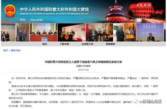 对此,中国驻意大利大使馆发表严正声明,指出“意大利个别政客罔顾事实、不分是非,执意与黄之锋搞视频通话,为‘港独’分子撑腰。这是极其错误和不负责任的行为。我们对此表示强烈不满和坚决反对。我愿重申,香港事务纯属中国内政,任何国家、组织和个人都无权干涉。希望有关人士切实尊重中国的主权,谨言慎行,多做有利于中意友好与合作的事,而不是相反。”