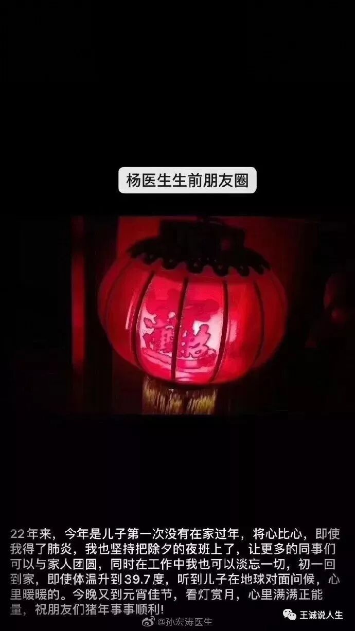 从杨文医生生前发的一条朋友圈,我们也可以看出,她是一个非常善良的人,有一个幸福的家庭,儿子在美国留学。对工作兢兢业业,即使是得生病也要坚持在除夕夜顶班,以便让更多的同事们可以和家人团聚,这一切满满地都是正能量,我们这个社会的发展,不就是靠杨医生这样普通而善良的人在支撑着吗?