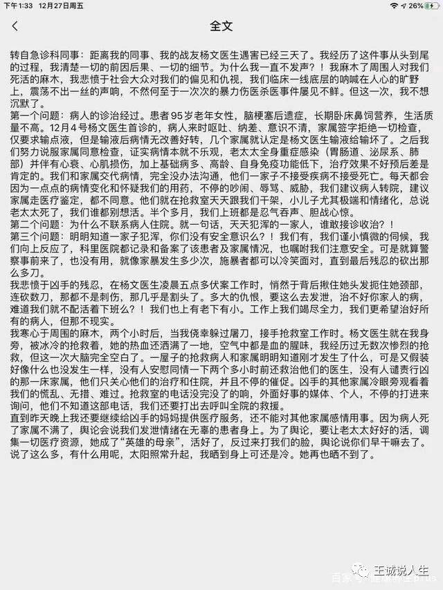 12月24日这一天,正是圣诞节前的平安夜(我们不过洋节,但是作为西化比较严重的医疗卫生行业,同时也是守护我们的平安的白衣天使,这个日子还是有特殊意义的)。北京民航总医院急诊科副主任杨文医生被患者家属孙文斌残忍杀害,当时正是早晨六点不到,大多数人还沉睡在梦乡,而杨文医生却再也看不到第二天的太阳了。