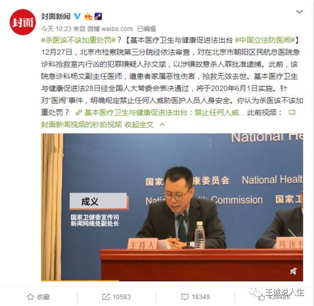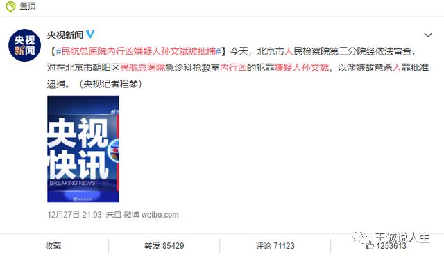 而孙文斌也在12月27日被北京市检察院第三分院以涉嫌故意杀人罪批捕,其实我觉得应该以恐怖袭击罪批捕,他的行为所造成的恐慌已经在全社会蔓延,尤其是对中国的几百万医护人员来说,那把刀也剌在了他们的心里,给他们造成的恐慌情绪可能需要相当长的一段时间才能平复。