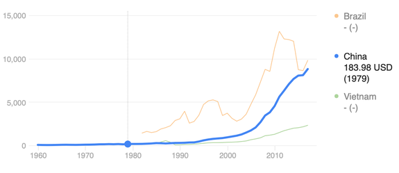 当时,中国领导人自信地宣布,到2020年,中国人均GDP将达到3000美元,国内生产总值达到4万亿美元。(2018年,中国人均GDP达到9732美元,国内生产总值达到13.6万亿美元)