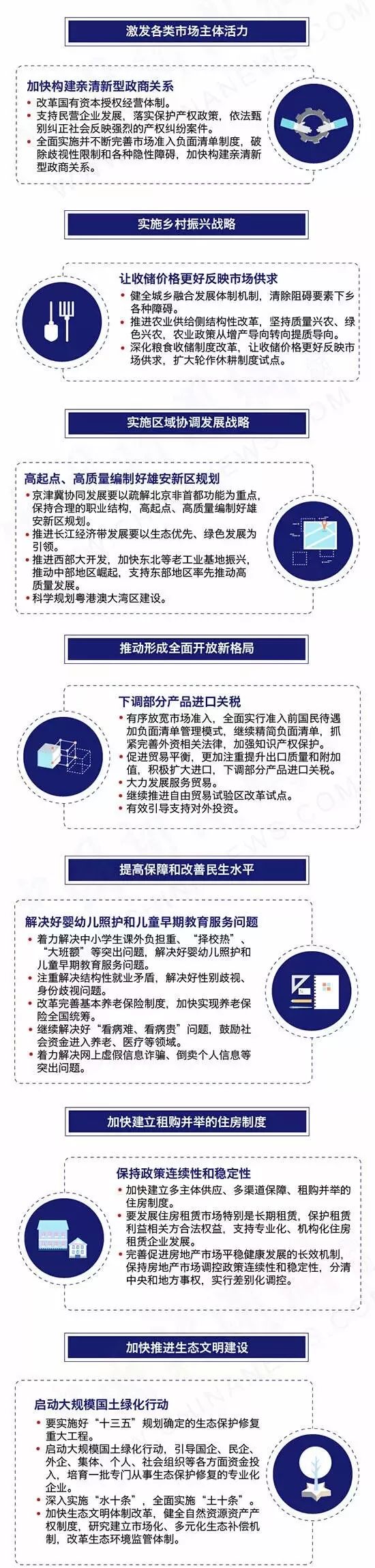 而在今年则是落实到八项具体的工作上,一是深化供给侧结构性改革,二是激发各类市场主体活力,三是实施乡村振兴战略,四是实施区域协调发展战略,五是推动形成全面开放新格局,六是提高保障和改善民生水平,七是加快建立多主体供应、多渠道保障、租购并举的住房制度,八是加快推进生态文明建设。这些内容可能大多数的读者不会太感兴趣,我就简单说一下,有兴趣深入了解的可以找来会议报告学习一下,或者跟我交流也可以。