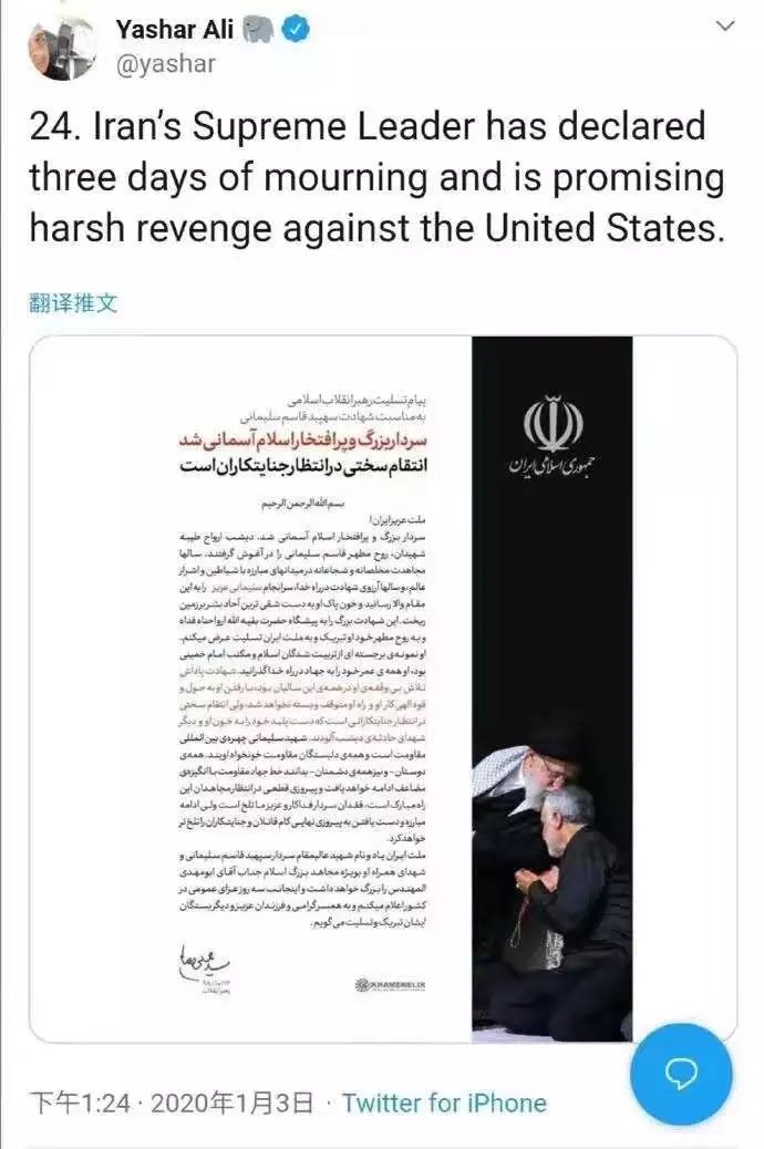 因此,消息传出后,伊朗举国震惊。据法新社报道,伊朗最高领袖哈梅内伊宣布一定会对美国进行“狠狠的复仇”。