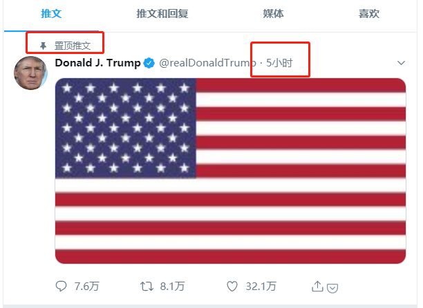 特朗普的态度也很耐人寻味。消息传出后,我们第一时间去看了特朗普的推特,上面除了日常的竞选巡演和咒骂媒体内容外,并没有什么特别。当我正奇怪时,一张美国国旗图片映入了我的眼帘。