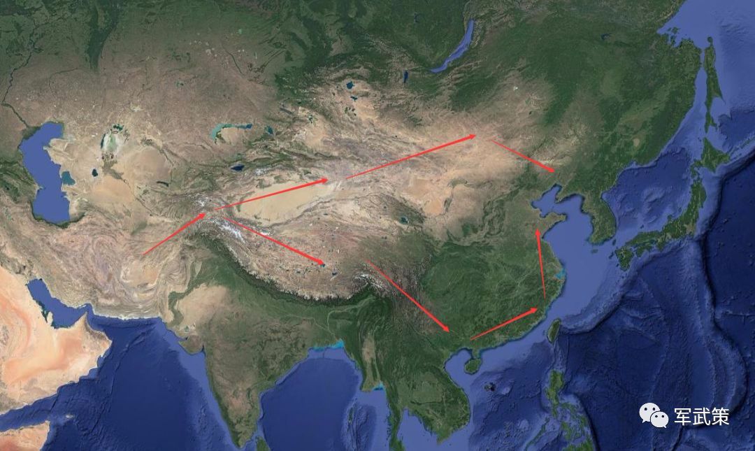 只要敌人连续跨过扎格罗斯山脉与兴都库什山脉,中国地缘结构的第二阶梯就将全线暴露在对方的铁蹄之下。比如他们可以向北穿越塔里木盆地后,经河西走廊攻克关中地区;向南,可以通过北面较为平缓的昆仑山脉进入青藏高原,并从昌都地区夺取四川。如果再进行一次战略大回旋,经云贵地区绕道东部沿海再一路北上,就可以完成对全中国的战略大包围!