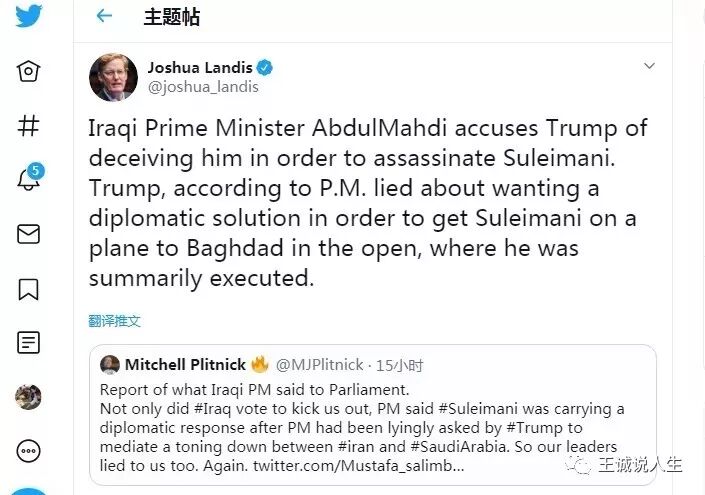 而且,当地时间5日,美国中东问题学者约书亚·兰迪斯(Joshua Landis)在推特上补刀,声称伊拉克看守政府总理迈赫迪指责特朗普为了杀苏莱曼尼而欺骗他。该推文表示,迈赫迪透露,特朗普谎称希望通过外交途径解决危机,把苏莱曼尼骗上了飞往巴格达的飞机,结果他就在巴格达遇袭身亡。