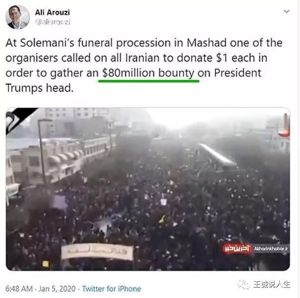 另一个更劲爆的消息就是伊朗方面悬赏8000万美元换特朗普的人头,因为美国国防部说是特朗普亲自下令暗杀的苏莱曼尼。据英国《每日邮报》1月5日报道,苏莱曼尼的遗体当天被运返伊朗,举行一连3天的葬礼,成千上万的伊朗民众夹道送葬,群情激愤。送殡队伍组织者呼吁伊朗民众每人捐出1美元,众筹8000万美元作为赏金,换取特朗普的项上人头。