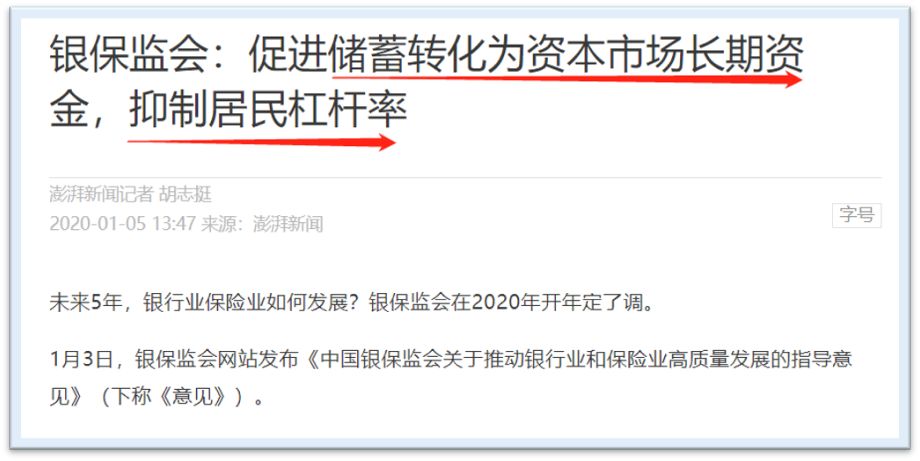 整个市场的目光聚焦于此,却有意无意忽视了更为关键的政策定调。近日,银保监会发文要求:银行保险机构要落实“房住不炒”的定位,严格执行房地产金融监管要求,防止资金违规流入房地产市场,抑制居民杠杆率过快增长,推动房地产市场健康稳定发展。同时,银保监会还指出,多渠道促进居民储蓄有效转化为资本市场长期资金。央行2020年工作会议提出,坚决打赢防范化解重大金融风险攻坚战,要加快建立房地产金融长效管理机制。熟悉政策走向的人不难发现,这里出现了三个公开的新提法: 从鼓励到抑制加杠杆,从鼓励买房到炒股,这两个政策转向,比降准影响更为深远。决策部门首提“抑制居民杠杆率过快增长”,究竟意味着什么?“个人住房加杠杆逻辑是对的。住房贷款应该有大力发展的阶段。”