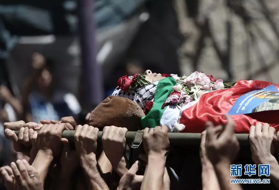 2014年7月25日,在约旦河西岸城市拉姆安拉,人们参加在以色列“护刃”行动中丧生的巴勒斯坦人的葬礼。图源:新华社(法迪·阿奥里摄)