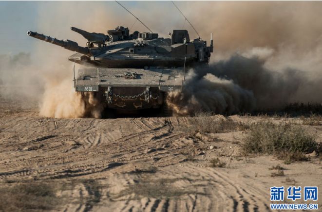 2014年7月17日,在以色列南部与加沙的边境,一辆以军梅卡瓦坦克在田野中行进。以色列国防军在当晚发布的一份声明中说,以军部队刚从各个方向对加沙地带发起地面进攻,“护刃行动”已进入一个新阶段。图源:新华社|李睿