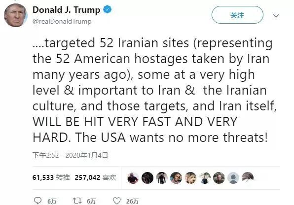 1月4日,面对愤怒的伊朗,特朗普在“推特”发出公开威胁:要打击52处伊朗目标,其中有些“在伊朗和伊朗文化中占有极其重要的位置”。
