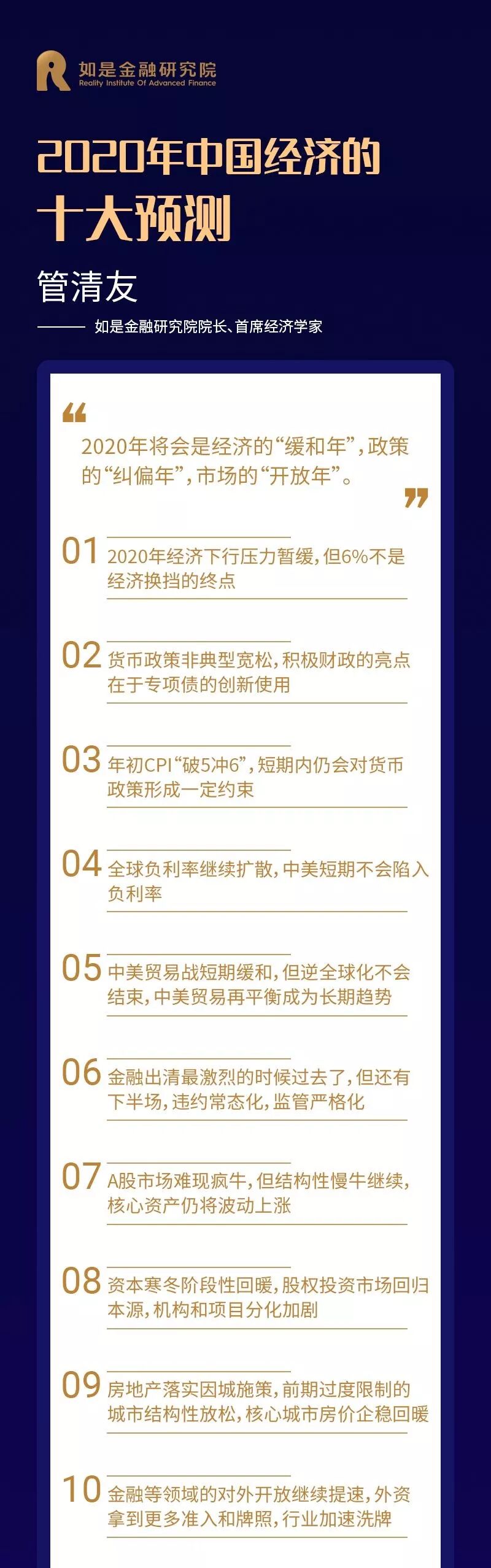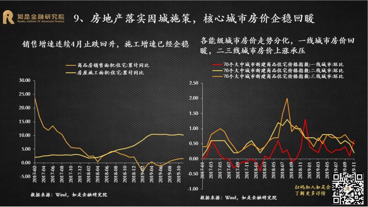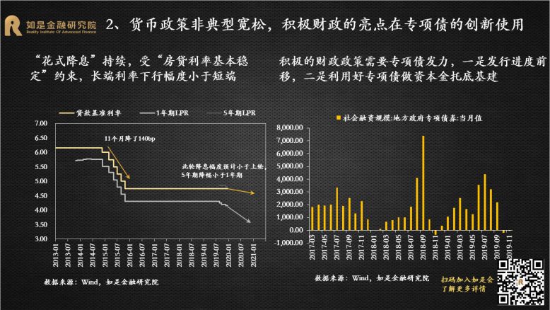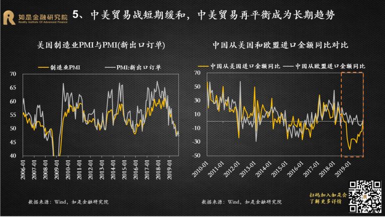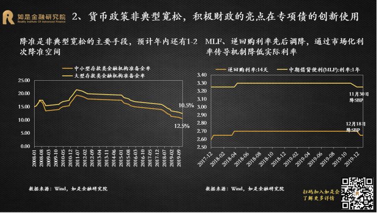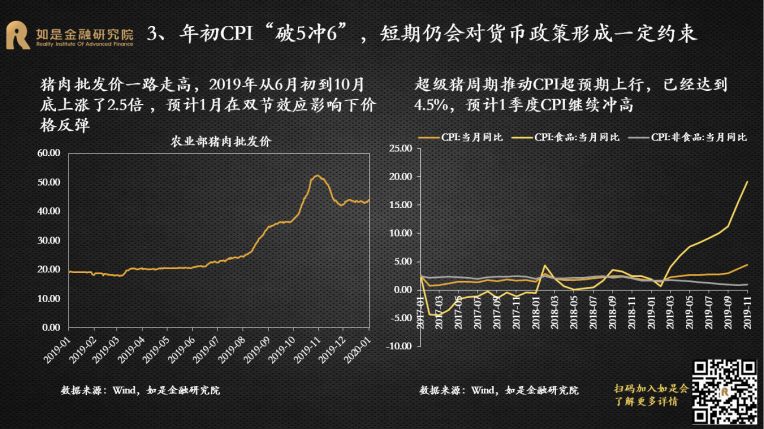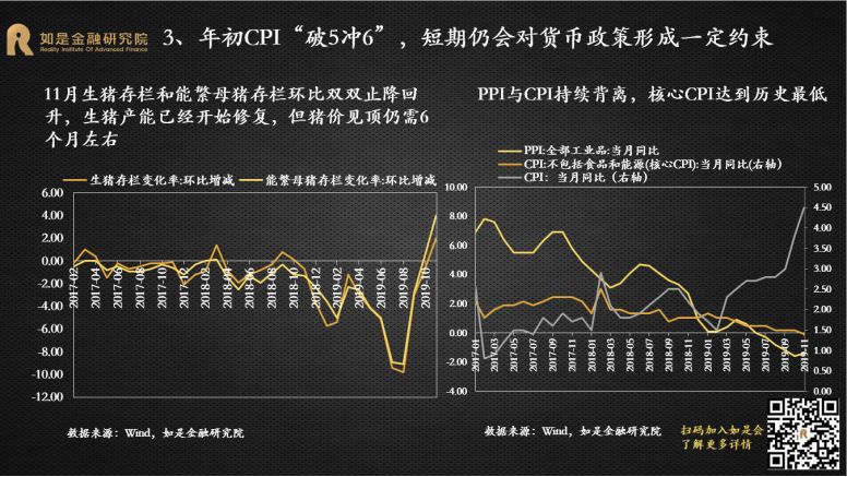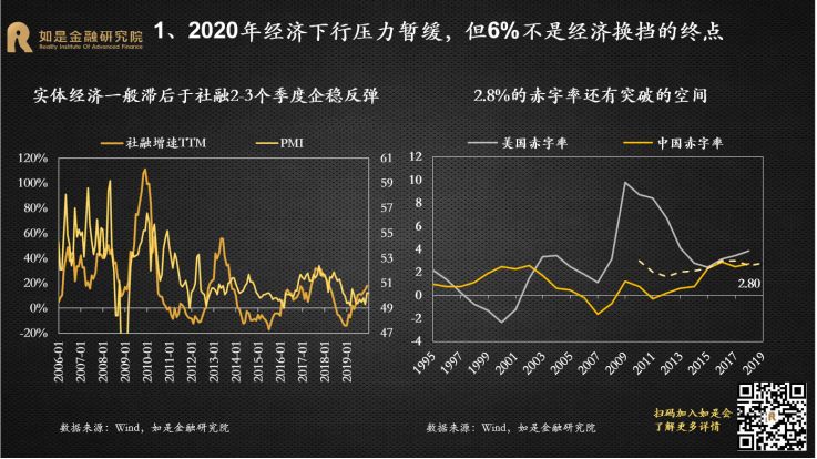 2019年是经济的“出清年”、政策的“宽松年”、投资的“丰收年”。尽管中国经济下行压力加剧,但受益于逆周期调节的发力和资本市场的改革开放,各类投资市场还是取得了不错的收益,尤其是A股市场。展望2020年,尽管经济下行压力犹存,但可能会相对“缓和”。政策面主要是对过去几年在执行中出现的偏差进行纠正,总体上还是友好的。对外开放的脚步仍将提速。不管是从宏观经济还是微观市场来看,主基调都会和2019年有明显的变化。短期来看,2020年中国GDP增速大概率能维持在6%左右,但单季可能破6%。本轮宽松从2018年开始,全年4次定向降准,落实减税降费;2019年逆周期调节的力度增大,全年3次降准3次降息,专项债增加8000亿。从政策效果来看,社融增速从2019年1季度开始改善,根据以往经验,实体经济将滞后于社融数据2-3个季度企稳反弹。2020年是全面建成小康社会关键的一年,经济仍然有“保6”的需求,将会进一步加大逆周期调节的力度。而且短期中国经济有能力“保6”,财政政策和货币政策还有继续宽松的空间。财政方面,专项债还有扩容的空间,2.8%的赤字率还有突破的可能,基建仍是逆周期调节的重要着力点,会撬动更多的社会资本,加大传统基建补短板和新基建投入力度,会在一定程度上托底经济。货币方面,目前的利率降幅还很小,1年期LPR只降了16bp,过去一次降息25bp起步,2014-2015年那轮降息周期,贷款基准利率下降了140bp。从国际经验来看,没有一个经济体能够长期保持在6%以上增速,也没有一个经济体能够在十年完成减速换挡,中国的换挡期也还有很长的路要走。根据海外经验,减速期平均时间为20年,最终稳定的GDP增速平均值为3%。美国经过减速期30年,经济增速从高点18.9%下降到3%。日本经过减速期30年,经济增速从高点13.1%下降到1%。韩国、泰国、台湾都经历了20年的减速期,经济增速从12%以上的高点下降到3%。中国经济增速从2008年步入换挡期,目前刚刚走过了10年,GDP增速从高点14.2%下降到了6.2%,还有至少10年的减速期。所以中国经济“破6”只是时间的问题。“稳增长”仍然是货币政策的首要目标,预计2020年还是非典型宽松。在核心CPI通缩、GDP临近6%边界以及全球货币宽松带来的空间和压力下,货币政策的逆周期调节还是很有必要。2019年的货币政策总体还是偏宽松,降准降息都已经出现。全年先后降准3次, LPR改革后,1年期LPR下调了16BP,5年期LPR也有所松动,下调了5BP。4季度先后下调MLF、逆回购利率。2020年元旦伊始,央行降准便如期而至,保障资金面的整体宽松,预计年内非典型宽松仍将延续。本轮宽松整体较为克制,搭配降准+花式降息组合拳,延续结构性宽松。2020年稳健的货币政策方向未变,“大水漫灌”式宽松难再现,大概率还是非典型宽松。宽松的力度会小于2008、2012和2014年三轮大宽松,动辄十几次的降准降息很难再有。2008年4次降准4次降息,2011-2012年3次降准2次降息,2014-2016年8次定向+全面降准6次降息。而2019年只有3次降准和改革式降息。今年年初资金缺口比去年更大,但降准的力度却更小,表明宽松仍然比较克制。“花式降息”持续,但短端利率和长端利率不再一刀切,且受制于通胀仍处高位,上半年降息空间并不大。1年期LPR缓步下调比较确定,5年期LPR预计也会下调,但受“房贷利率基本稳定”的约束,下调的节奏和节奏会明显小于短端。积极的财政政策不变,但强调“压缩一般性支出”,专项债的增加不会像2019年这么多,重点在创新使用。积极的财政政策需要通过专项债发力,但2019年的中央经济工作会议删掉了关于大幅增加地方专项债的表述,要想更好地通过专项债稳增长关键在专项债的创新使用上。一是加快发行使用进度,目前国务院已经提前下达了1万亿的2020年专项债额度,2020年上半年大概率会密集发行。二是扩大专项债使用范围,今年会更多的用于支持基建。三是创新专项债的融资模式,利用好专项债做项目资本金,降低地方政府重大项目启动的投资门槛。2019年下半年以来,超级猪周期推动CPI同比涨幅持续超预期上行,形成约束货币政策宽松的掣肘。本轮超级猪周期由内生和外生因素叠加推动形成。从内生因素来看,上一轮猪周期累积的过剩产能逐渐出清完毕,能繁母猪和生猪存栏量已经分别下降了18个月和12个月,生猪存栏处于历史低位,猪价存在内生上涨动力。从外生因素来看,2015年以来“一刀切”的环保政策、“南猪北养”的布局调整和规模化养殖策略使大量散养农户和不符合环保规定的大型养殖场纷纷退出生猪养殖,造成生猪存量持续下降。非洲猪瘟疫情传入使大批生猪受到感染,扑杀生猪近120万头。由于没有有效疫苗,生猪养殖仍然面临较大挑战。农业部猪肉批发价从6月初的20.9元/公斤一路上升到10月底的52.4元/公斤。11月CPI同比涨幅超预期达到4.5%,创下12年来新高。1月元旦春节双节效应推动CPI“破5冲6”。短期来看,今年春节提前到1月,需求有所回升,预计1月CPI在元旦、春节双节效应下出现高点,大概率突破5%甚至逼近6%。预计2月开始CPI从高点回落,但考虑到前期由于养殖户恐慌性抛售消耗了部分产能,猪价可能在一季度出现报复性上涨。再加上疫情可能出现反复,冲击生猪补栏。因此上半年除了1月高点外可能还会出现反弹。长期来看,目前生猪产能已经开始修复,预计通胀最快下半年开始回落。11月生猪存栏和能繁母猪存栏环比