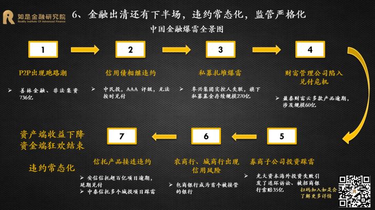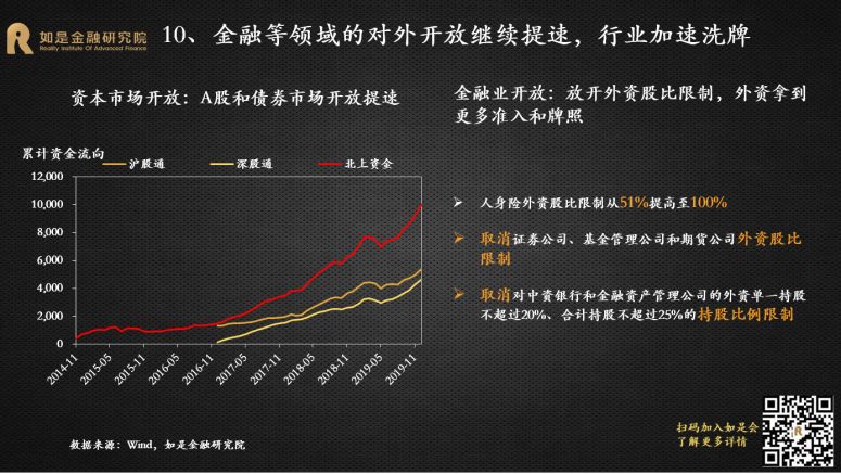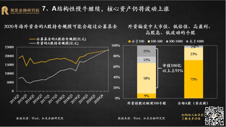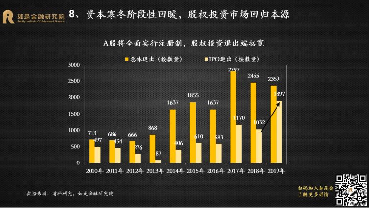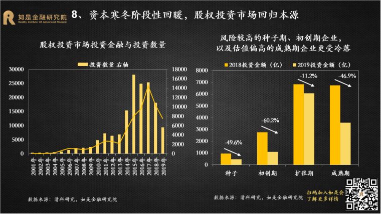 从非持牌到持牌金融机构,从非上市到上市公司,从小微到龙头,从局部到全局,风险爆雷从过去的星星点点到如今的星火燎原,集中释放。违约已经从金融体系的五环外蔓延到核心区,能波及到的基本都已经波及到了。2020年金融出清进入下半场,资产端与资金端错配,违约进入常态化。这场金融大出清已经过半,出清的范围基本覆盖了所有机构产品,下半场主要是存量资产的出清,可以说最激烈的时候已经过去了。从资产端来看,中国经济至少还有10年的减速期,整体上波动向下。各个经济部门均面临出清的压力:服务贸易逆差不断扩大、财政扩张表内规模有限、人口红利消退、房地产进入“白银十年”、企业去杠杆仍在途中。资产供给快速收缩,带动整体收益率下行。从资金端来看,央行已经清楚认识到不能一味寄希望于货币宽松来刺激经济。未来的货币政策一定是“正常化”,整体较为克制,很难再出现大规模宽松。当资产端泡沫退潮,资金端狂欢结束,资产端收益比资金端的成本下降的更快,可以预见未来违约将会进入常态化。金融监管从分业到统一,强力监管下金融乱象难再现。过去10年出现资产泡沫很重要的原因是出现了巨大的监管漏洞,如各种交易所、各种P2P平台初期均无有序监管,导致乱象丛生。2017年金稳委成立后,大央行回归,开启监管统一化新时代。先是央行将表外理财正式纳入MPA考核,紧接着银监会发布一系列监管文件整治“三套利、三违反、四不当、十乱象”,掀起一场监管风暴。之后证监会加强公募基金流动性风险管理,年末大资管新规开始打破刚兑、禁止资金池、严控杠杆、规范并购重组、消除多层嵌套和通道等等。金融监管从分业到统一,防风险成为三大攻坚战之首,监管趋严背景下,过去几年出现的金融乱象会逐步减少。2020年A股市场将表现为结构性牛市,核心资产仍然有升值空间。从盈利来看,上半年工业经济的价格和利润都会有一定的修复,A股企业净利润增速也将企稳回升,预计2020年全年A股盈利增速将回归正值区间。从估值来看,货币政策将继续宽松,估值修复还会延续,但是空间有限,难现疯牛。一是因为货币政策在上半年会受到CPI高位的制约,还要防止资产泡沫重燃,货币政策宽松的空间有限;二是因为估值已经修复到历史平均水位,当前上证综指和创业板指的估值分别为13.1和49.9,估值水位位于2010年以来的45%和50%,没有估值低位的优势;2019年万得全A指数估值增加了33%,最大涨幅43%,2020年不会有这么大的空间。从结构来看,个股的基本面继续分化,海外资金继续流入,抢筹核心资产,核心资产仍将波动上涨。目前龙头与非龙头企业的营收TTM增速相差5.3%,差距有所扩大;龙头企业的营收增速在2019年基本走平;而尾部企业从2018年4季度开始营收增速就下降到了-20%左右。第一,资本市场改革不断加速,助力A股市场的生态重建,加速价值化投资理念的形成。2019年12月,新修订的证券法审议通过,将于明年3月1日施行,新证券法明确了全面推行注册制,并进一步加大对证券违法行为的处罚力度。资本市场改革将加速A股市场的生态重建,在健康、规范、公平的新市场环境下,价值化投资将成为主要原则。第二,外资流入增加,抢筹核心资产。目前A股市场的外资的持仓市值已经达到了1.8万亿,与国内基金持仓(2.1万亿)和保险持仓(2.3万亿)在同一水平,而且还在持续净流入。根据我们对目前外资对A股、韩国股市、台湾股市的风格偏好研究,外资偏爱消费和主导产业的个股,尤其是龙头股;偏爱金融龙头;偏爱中大市值、低估值、高盈利、高股息、低波动的个股,整体风格偏价值。2019年股权投资市场处在“资本寒冬”,投资总额较2018年下降27.5%,投资案例数量下降48.2%。天使轮和pre-A轮投资金额同比下降最多,分别下降了约80%和60%,反映出经济下行压力增大的背景下,股权市场中风险较高的种子期和初创期企业更受冷落,市场的风险偏好偏低。成熟期企业的融资金额也大幅下降了约50%,主要原因是一二级市场估值倒挂。很多新上市的“独角兽”公司股价表现很差,不少企业现在的市值还不如上市前融资的估值,比如小米当前市值300多亿美元,而上市前末轮融资时估值450亿美元,从而导致投资人认为当前成熟期企业价值普遍被高估。2020年股权投资市场的积极因素正在增加,资本寒冬可能出现阶段性回暖。首先,A股注册制改革、并购重组松绑,以及港交所上市新规吸引新经济企业和独角兽赴港上市,拓宽了股权投资的退出渠道。第二,由于资管新规的要求,加上金融爆雷持续不断,类固收产品逐渐打破刚兑,过去8-10%的无风险收益不存在了,股权投资的需求将不断上升。第三,地方政府股权投资增加,既是纾困民企,也是战略投资。2019年1-11月新备案的基金中,有22%的私募股权基金LP为国资背景,国资认缴规模占总认缴额的75.2%;2018-2019年,A股上市公司中有42家民企被国企并购。第四,股权市场目前处在估值的底部,过去两年中有很多优质的项目被“误杀”。长期来看,股权投资市场已经从“赚快钱、赚大钱”的爆发阶段进入到“赚慢钱、赚长钱”的分化阶段。注册制并非仅是简单的上市制度的改变,更是一二级市场企业长期真实价值的“试金石”。注册制将会缩小一二级市场企业上市初期的估值价差, Pre-IPO投资时代彻底褪去,长期价值投资时代来临。同时,A股市场退市制度也在不断