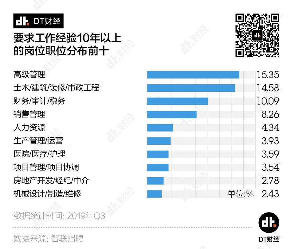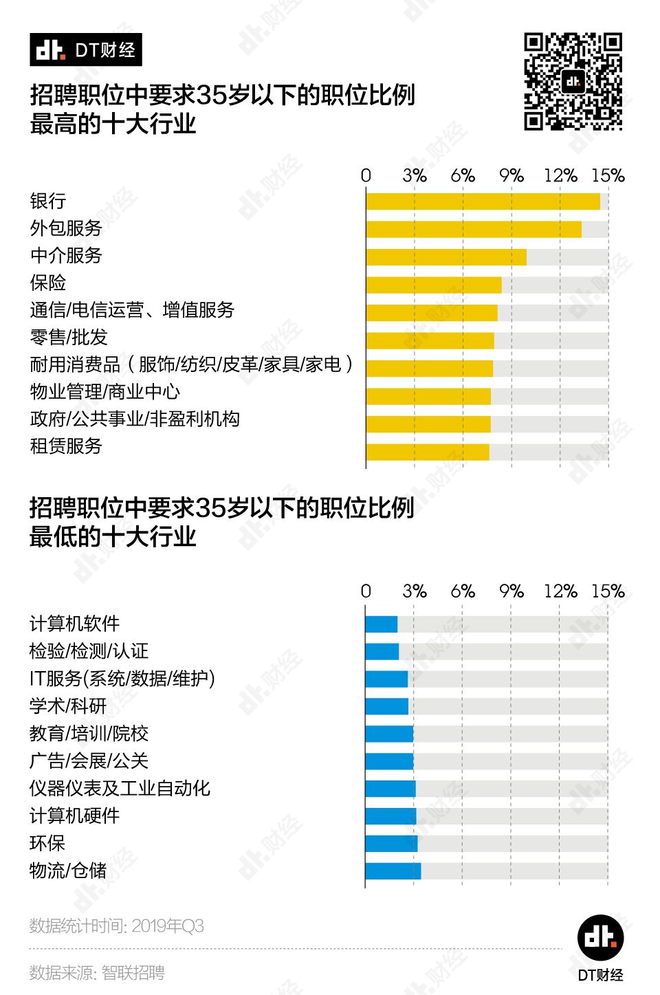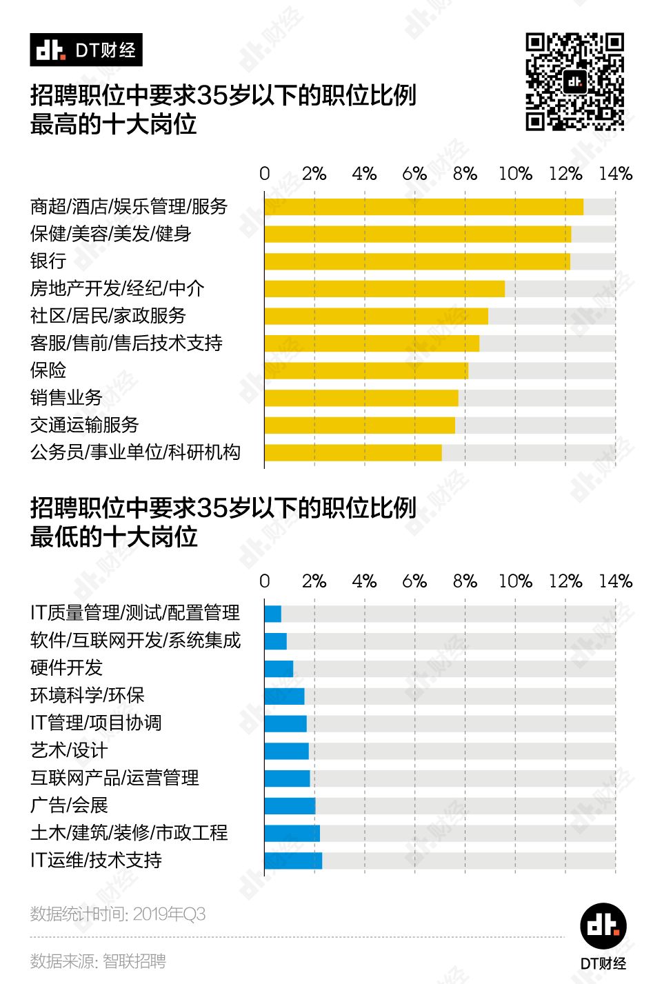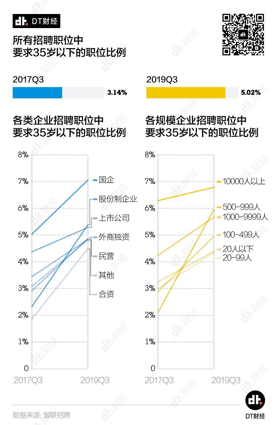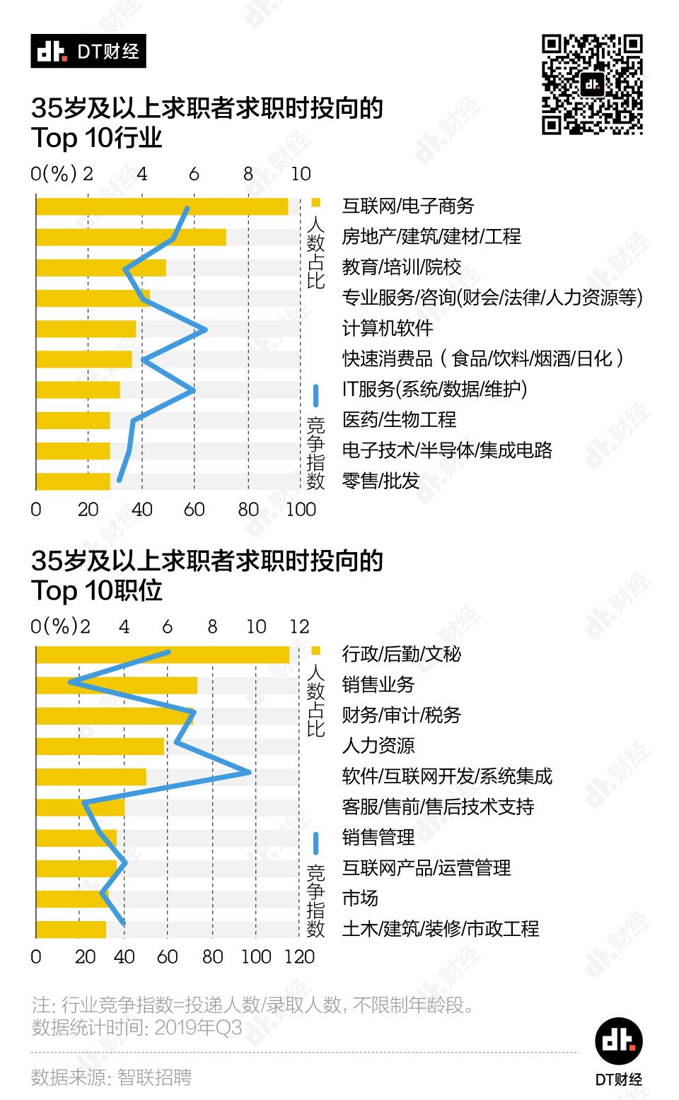 这让还未到35岁的DT君,内心多少有些焦虑:35岁的职场人就业真有这么难吗?他们都面临着怎样的中年危机?难道除了卖保险,真的就无处可去了吗?DT财经联合智联招聘共同做了个小研究,通过招聘方与应聘者的数据,来看看35岁职场人真实的生存情况。首先,我们想知道,35岁真的面临一个更残酷的世界吗?从人口结构的大盘面粗略判断,当代中年所面临的竞争,其实并不如他们的前辈或后辈那样激烈。根据2010年国家第六次人口普查数据,到2019年我国34-43岁的中年人口数量为1.98亿,而44-53岁人口数量为2.42亿,24-33岁人口数量为2.27亿。也就是说,不管是曾经的,还是未来的中年人,都比现在叫嚷着中年危机的劳动力数量旺盛不少,而他们所面临的,可并不是高速发展的黄金十年。招聘方对岗位需求的描述,一定程度上能反映出职场的变幻风向。从招聘需求来看,2019年第三季度所有的招聘岗位中,只有5%明确要求求职者的年龄低于35岁。这个看起来并不高的比例,可能并不能完全说明市场的真实需求情况,毕竟从大家的日常吐槽和我们的小范围调研来看,许多公司对年龄的苛刻要求很多时候秉持着只干不说的原则,并不会明晃晃地写在岗位简介里。但我们注意到一个变化趋势,明确要求求职者35岁以下的岗位比例,与两年前相比上涨了2个百分点,涨幅其实挺大的(60%)。这事实上表明,35岁职场人面临的境遇,确实是比两年前更难了些。以这5%要求35岁以下的招聘职位作为研究样本,我们大致研究了下不同地方对中年职场人的友好度。在各类企业中,要求35岁以下的职位比例最高的是国企,而民营公司在岗位要求中对35岁的求职者其实相对温和。而从公司规模来看,规模越大的公司,要求35岁以下的职位比例就越高。10000人以上的超大公司在2017年就已超过6%;500-999人肩部大公司在两年前的比例还仅有2.1%,但两年间提高了近4个百分点至6%。要求35岁以下的职位比例越来越高,其实与就业大环境和新兴行业的发展有关。Linda在一家大数据创业公司做HR,她告诉DT君:“这两年在招人的时候确实会优先选择35岁以下,甚至是30岁以下的年轻人,尤其是18年的裁员潮过后,大家其实都不好过。一般达到35岁的职场人在公司都担任比较重要的职务,而我们大数据属于新兴行业,公司的业务变化很快,在探索阶段并不需要那么多指挥官,我们更需要富有创造力、行动力强听指挥的战士。”Linda的话意味着,是否能在35岁前找到一家托付终身的企业至关重要。可是,在35岁就找到能够让自己奋斗一生的公司,就和20岁就找到长相厮守的老伴一样不靠谱。这时候,选对行业很关键。DT君整理了2019年招聘需求中要求35岁以下职位比例最高和最低的行业。我们发现,在众多行业中,银行、外包服务、中介服务、保险和通信行业对年龄的限制最大。也就是说,这些行业中有相对更多的岗位只需要年轻力壮的劳动力。但也有计算机行业、检验检测、IT服务、学术科研和教育培训等行业,在招聘需求中对35岁以上的职场人相对比较宽容。如果看一下这些行业给大家的固有印象,我们可以认为,在招聘中更看重35岁年龄线的行业,多属于大家印象中的传统行业;而在要求35岁以下职位比例最低的队伍中,新兴行业的比例会更高些。从岗位来看,商超、保健、银行、房地产、社区等技术门槛较低的基础类岗位,在招聘中要求35岁以下的职位比例最高。总结下来就是,工作内容更简单或对知识性技能要求更低的岗位,会更偏爱年轻人,毕竟人到中年,精力和体力都无法和年轻人相比。对于用人单位来说,与其去招一个成本更高的中年员工,不如多招几个应届大学生,年轻力壮,生产力更强。而要求35岁以下职位比例最低的10个岗位中,IT、软件、硬件开发、IT管理、互联网产品、IT运维等互联网/技术岗位占去了大半,这都是对专业技术、创新性要求更高的行业岗位。至少从招聘需求来看,他们并不会太多强调年龄。35岁话题中最常被吐槽的,恰好是这些不那么强调年龄的岗位从业者,而那些在招聘需求中有更多年龄限制的岗位,存在感并不太强。我们需要明确的是,一个行业或岗位对年龄的限制少,并不意味着中年的求职者就会获得青睐。35岁求职者的优势在于有更多经验与技能积累,而劣势在于体力和精力不够充沛,只有在更需要经验而非体力的岗位,中年职场人才会有更强的竞争力。即使我们默认那些并没有对35岁划线的岗位都不需要干体力活,也并不意味着在这些岗位上,经验、积累和阅历就会有比较大的增值效果——如果年龄buff不能增效,用人单位自然会聘请更年轻、薪资要求更低的求职者。所以,关键点在于,中年职场人是否进入了自己具备优势的行业。根据智联招聘2019年第三季度的数据,互联网、房地产、教育培训、专业服务、计算机软件等行业,挤下了最多的35岁及以上求职者,而行政/后勤、销售业务、财务/审计/税务、人力资源和软件/互联网开发/系统集成等则是他们投递最多的职位。我们计算了各个行业和岗位中简历投递数量与最终录用数量的比值,命名为竞争指数,以此来衡量应聘竞争的激烈程度。我们发现,互联网、房地产、计算机软件、IT服务的行业竞争都格外激烈,而从职位来看,软件/互联网开发/系统集成的竞争指数更是一骑绝尘,97个人参与摸奖,只有1个人能获得offer,另外财务/审计/税务、人力资源、行政等职位的竞争指数也挺