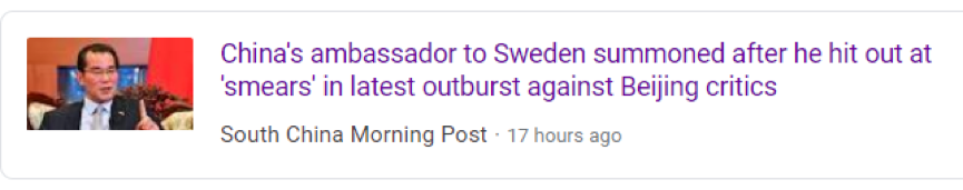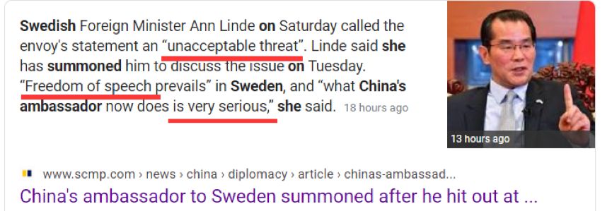 据环球时报转引香港《南华早报》的报道称,近日瑞典外交部“召见”了中国驻瑞典大使桂从友。这次召见,原因很奇葩,报道说是由于最近桂大使针对瑞典媒体喜欢颠倒黑白抹黑中国提出了批评,并建议他们到中国看看,结果瑞典政府认为这对瑞典的“言论自由”构成了“严重威胁”。