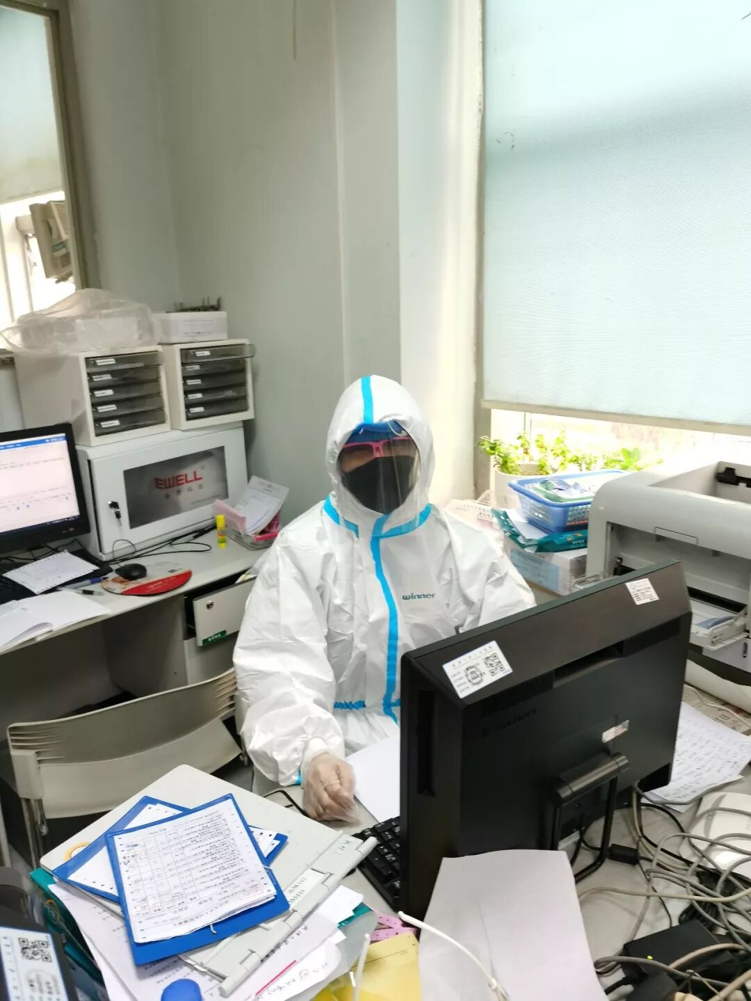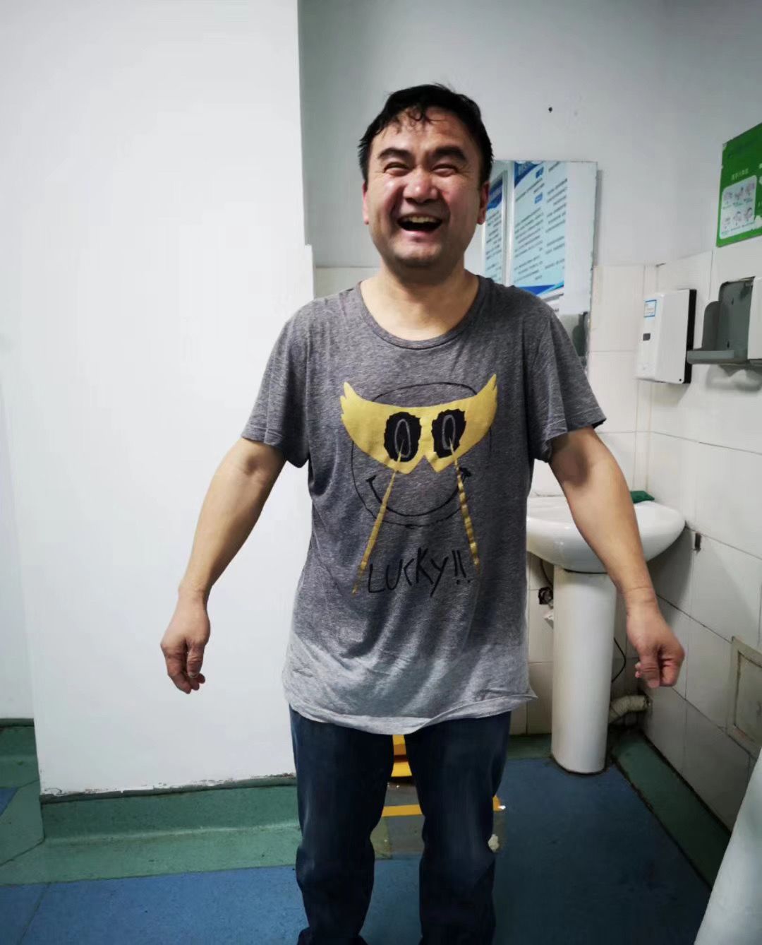 穿着厚重防护服连续工作5小时后的余追教授,脱掉防护服笑着说:无论多么困难,多么疲惫,多么富有挑战,依然微笑面对。