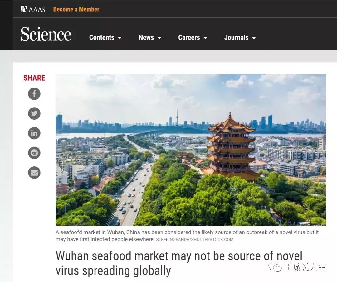 近日,世界上最权威的《科学》杂志(SCIENCE)就发表了一篇文章,题为《武汉海鲜市场可能并非新型冠状病毒发源地》(Wuhan seafood market may not be source of novel virus spreading globally)。
