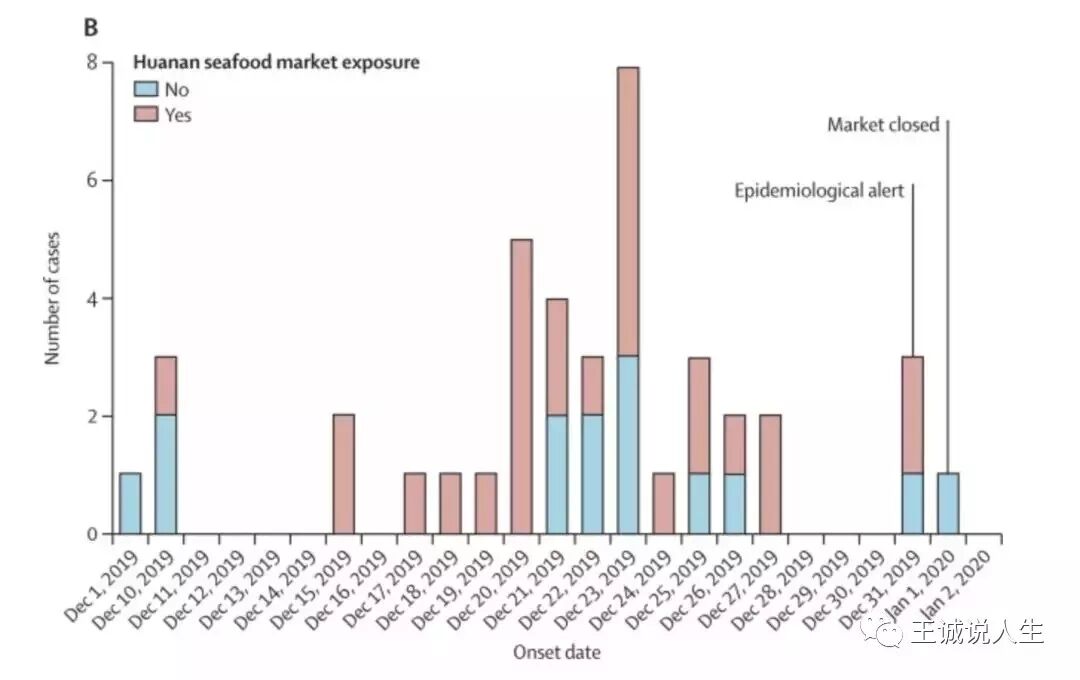 第二个看点就是,最早在12月1日报告的首批案例中,总共有13个病例与华南海鲜市场毫无接触史,而且在第一个病人与后续病人之间也没有发现任何流行病联系!