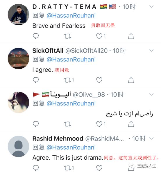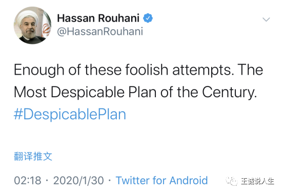 伊朗总统鲁哈尼则第一时间发表推特称:“受够了这些愚蠢的企图,这是本世纪最卑鄙的计划”,并带上了“卑鄙计划”的话题标签。鲁哈尼还直言不讳地指出,这是犹太复国主义政权和美国之间的协议,跟巴勒斯坦人没有任何互动。这是鲁哈尼继11日就伊朗军方误击乌克兰民航飞机表示哀悼后首次发帖。在下方评论中,许多网友对鲁哈尼的说法表示了赞同。