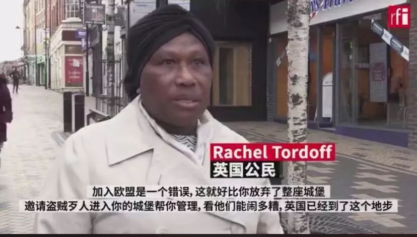 英国这个老百姓有意思,作为一个黑人,她无比反感新移民的到来,把他们形容成强盗进了城堡代替主人管理。这也很符合人性,就好像上公交,没上去的希望门别关,上去的就喊,人够了关门赶紧开。