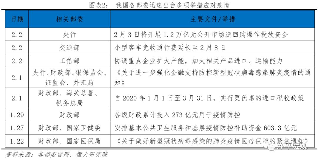 疫情发生后,央行、财政部、证监会等多部委快速出台应对方案,释放稳定预期信号,对冲疫情影响,为受疫情影响的地区、行业、企业提供信贷支持,保证企业资金链、现金流的接续,提振市场信心,维护市场稳定。央行表示,将加大逆周期调节力度,通过公开市场操作、常备借贷便利、再贷款、再贴现等多种货币政策工具,保持金融市场流动性合理充裕,2月3日开展1.2万亿元逆回购操作。同时引导金融机构加大信贷投放支持实体经济,促进货币信贷合理增长。财政方面,截至2020年1月29日下午5时,各级财政已累计下达疫情防控补助资金273亿元,确保疫情防控经费需要。