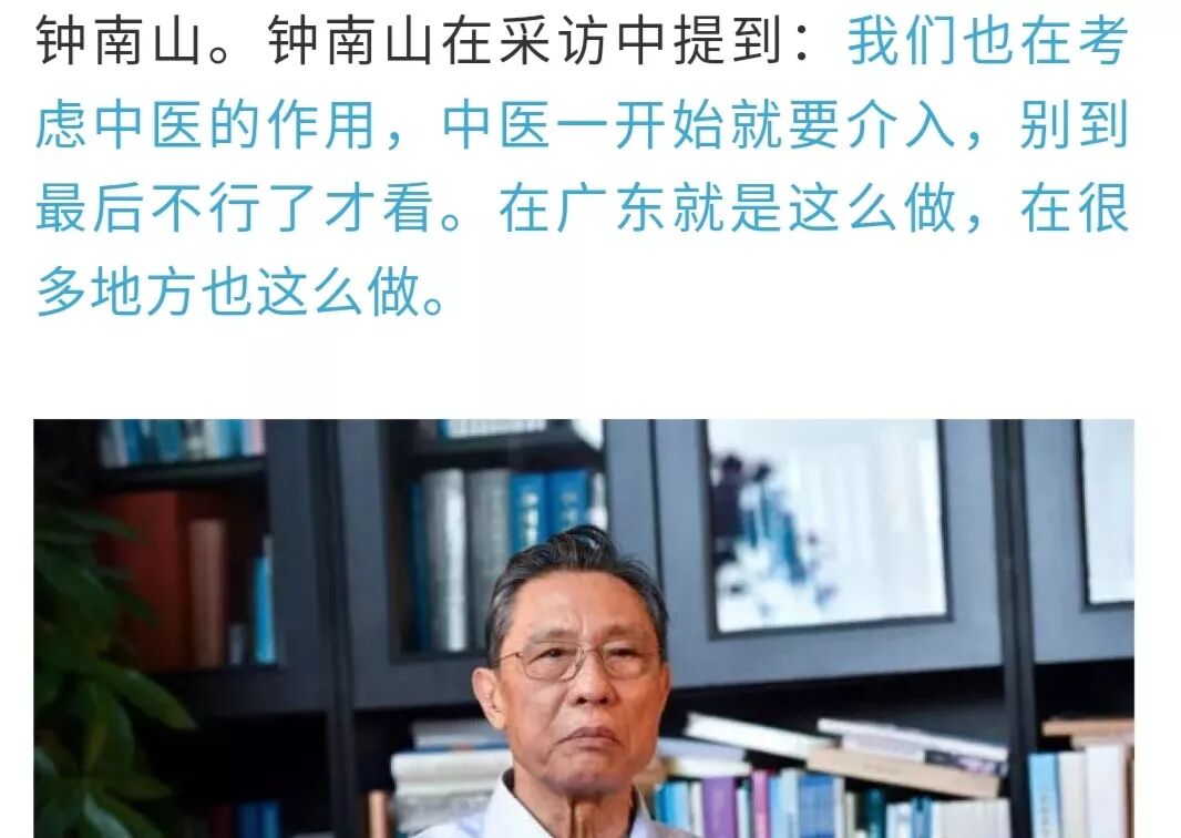 29日,钟南山院士表态支持中医:“中医一开始就要介入,别到最后不行了才看。”