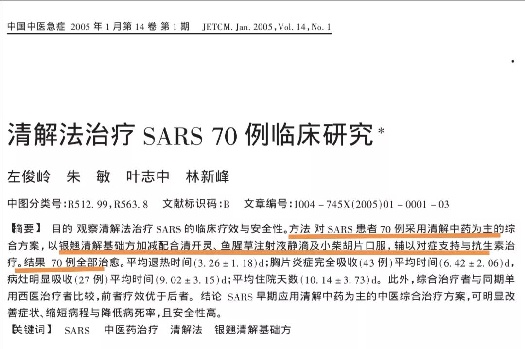 下面的论文《清解法治疗SARS 70例临床研究》记录了他们对其中70例病人治疗的研究: