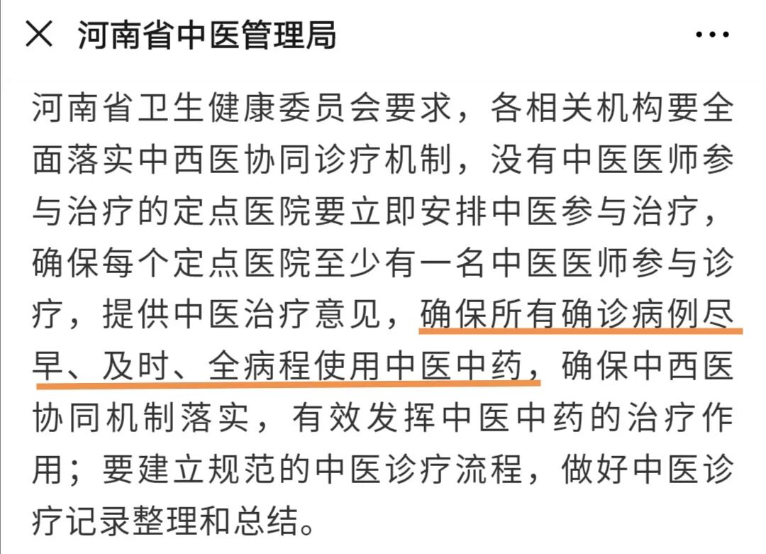 1月27日,河南省卫生健康委员会要求,确保所有确诊病例尽早、及时、全病程使用中医中药,确保中西医协同机制落实,有效发挥中医中药的治疗作用。