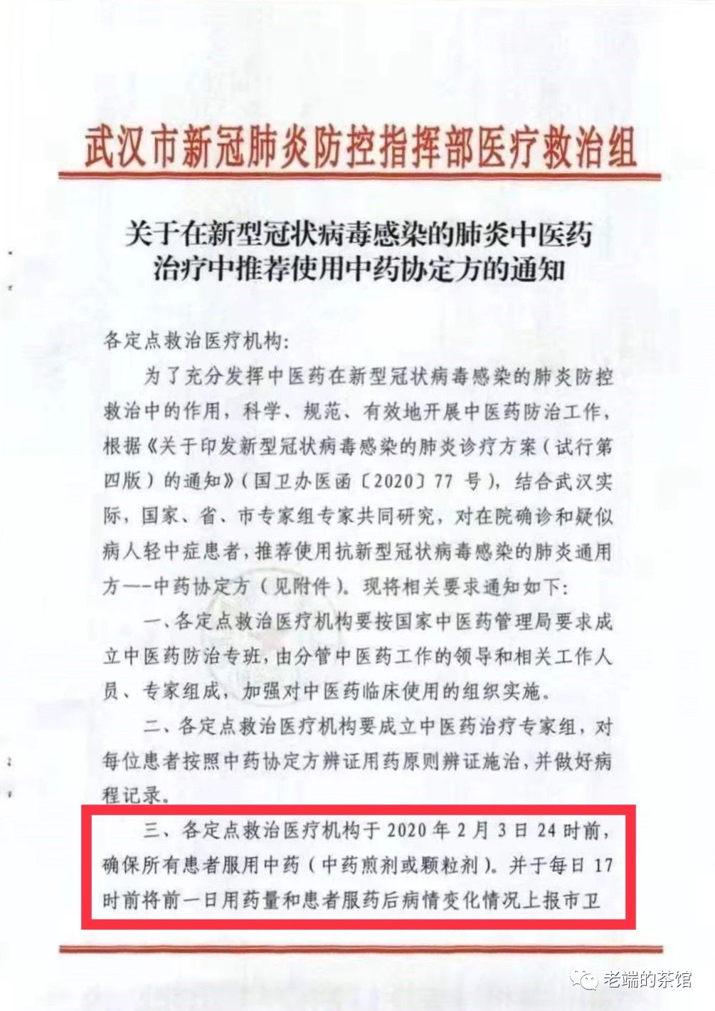 图中第三点特别重要,强调要在今天24点之前,确保所有患者服用中药,并且每日要上报情况。而且,所有定点医疗机构全部要配备中医药小组。