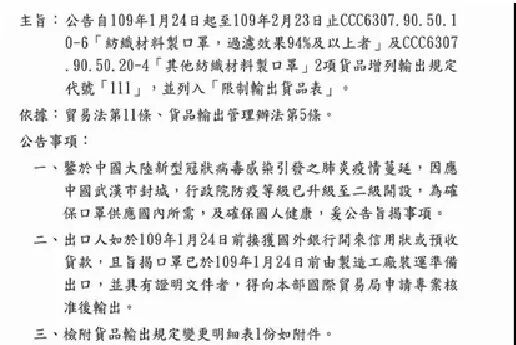 台湾当局“经济部”公告,自1月24日起至2月23日止,为期1个月期间,过滤效果94%及以上的纺织材料制口罩,及其他相关纺织材料制口罩“管制出口”。