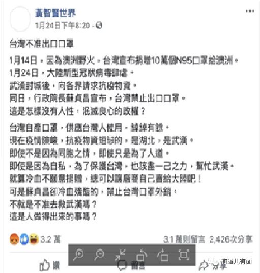 台湾名嘴黄智贤更是一针见血的指出:不久之前,澳洲大火,台湾捐赠10万个N95口罩,现在武汉抗疫物资短缺,我们台湾却禁止出口,“这是怎样没有人性、泯灭良心的政权”“这是人做得出来的事吗”……