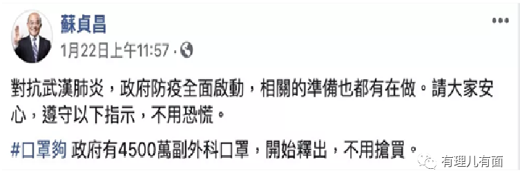 那么早在1月22日,台湾“行政院长”苏贞昌就在脸书上说,口罩管够,根本不用抢买。这话又作何解释?