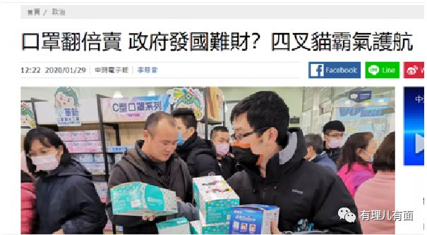 在销售层面,据台湾媒体报道,从1月28日下午开始,连续三天,“经济部”每天都会释出600万片医疗口罩,各大超商每人限购三片,每片8台币。有台湾百姓指责道:政府趁机发国难财,一片平时3~4台币的口罩现在卖到8台币,口罩翻倍卖。