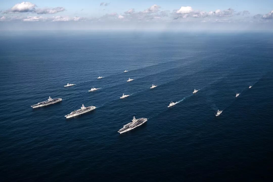 图为美国里根号、尼米兹号、罗斯福号三航母编队