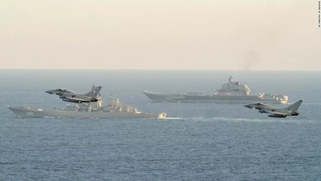 编队中的俄罗斯“库兹涅佐夫”号航母被英军台风战斗机监视着,左边是“彼得大帝”号核动力巡洋舰。