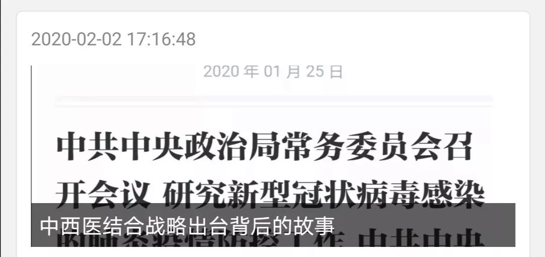在这样的背景下,2020年1月25日,政治局召开会议,确立落实了中西医结合的战略。