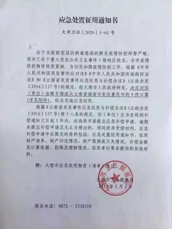 2月2日,云南大理市的一份《应急处置征用通知书》显示,一批发往重庆市的口罩,被大理市政府应急征用。然而,这批物资却是重庆市政府指定企业采购用于重庆市疫情防控的紧急物资。