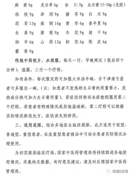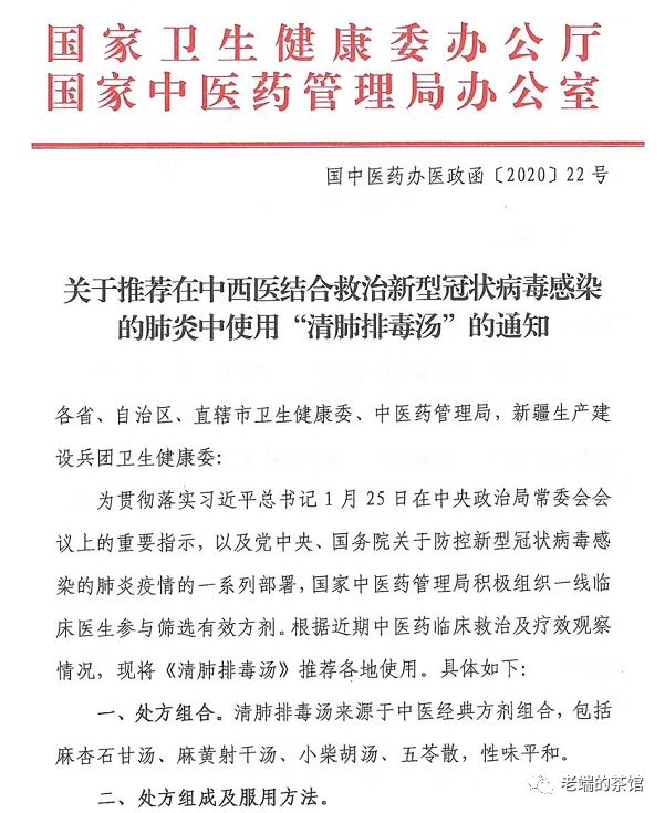 据国家中医药管理局的文件,4个试点省份运用中药清肺排毒汤救治确诊病例214例,3天为一个疗程,总有效率达90%以上,其中60%以上患者症状和影像学表现改善明显,30%患者症状平稳且无加重。因此国家卫健委发了红头文件,全面推广“清肺排毒汤”,下面就是内容: